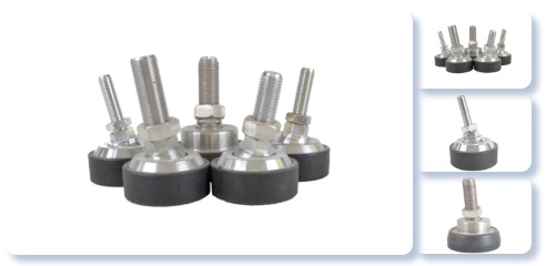 Patas niveladoras para celdas tipo viga (SHB). o Báscula monocelda. Las cuales están fabricadas con un balin interno que disminuyen el riesgo de que fuerzas axiales (fuerzas laterales) dañen la celda de carga, fabricadas en aleación de acero y goma para mayor adherencia al suelo. Disponibles con roscas ½”, ¾”, M12, M16, otros.